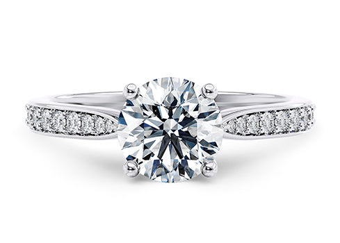 A beautiful traditional diamond engagement ring with a modern diamond set shoulder band. The diamond set shoulders taper toward the centre to highlight and exhibit the central diamond. The round brilliant shoulder set diamonds will be a minimum G colour and VS clarity.