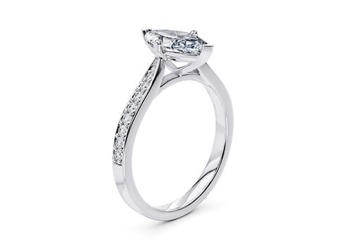 A beautiful traditional diamond engagement ring with a modern diamond set shoulder band. The diamond set shoulders taper toward the centre to highlight and exhibit the central diamond.