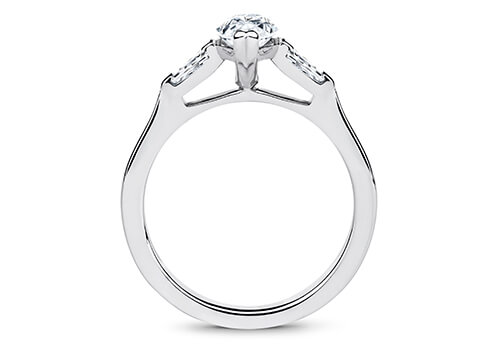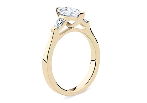 A modern trilogy ring that offers a simple yet stunning design. The centre diamond is accompanied by two tapered baguette cut diamonds. Set in tapered ring band with open daylight shoulders allows this trilogy ring to sparkle with a striking appearance.
