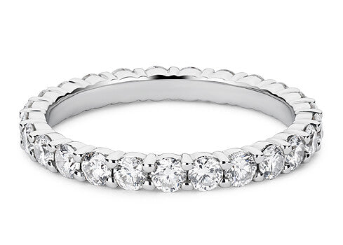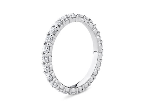 A modern claw set diamond eternity ring. A claw set band with round brilliant cut diamonds. Each diamond is held in place by small claws to highlight their beauty.