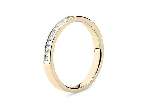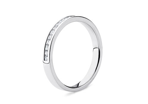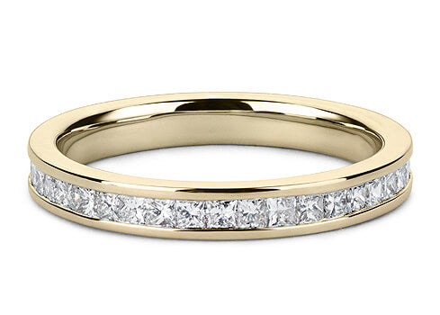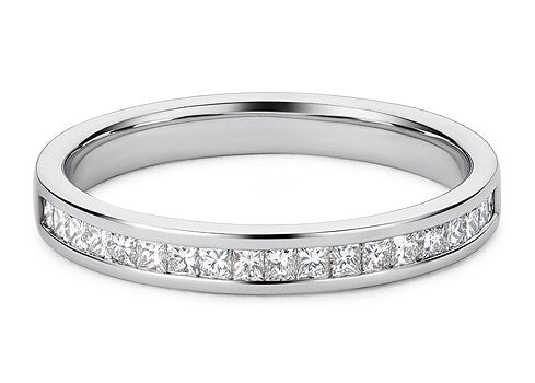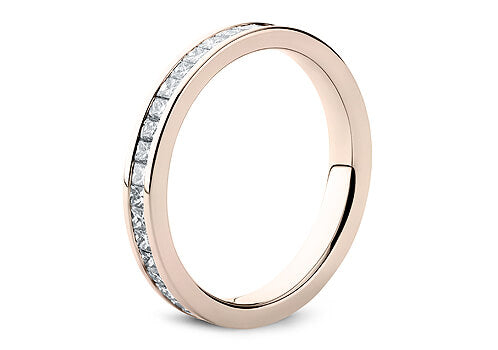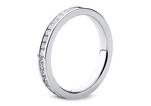 A luxurious channel set diamond eternity ring. A flat court channel set band with princess cut diamonds.